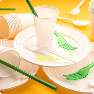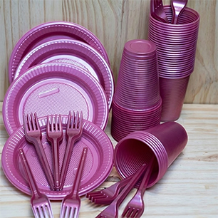 Canudos, copos, talheres e descartáveis usados em festas, restaurantes, buffets e catering; sacolas, sacos de lixo, sacos e filmes plásticos em geral.